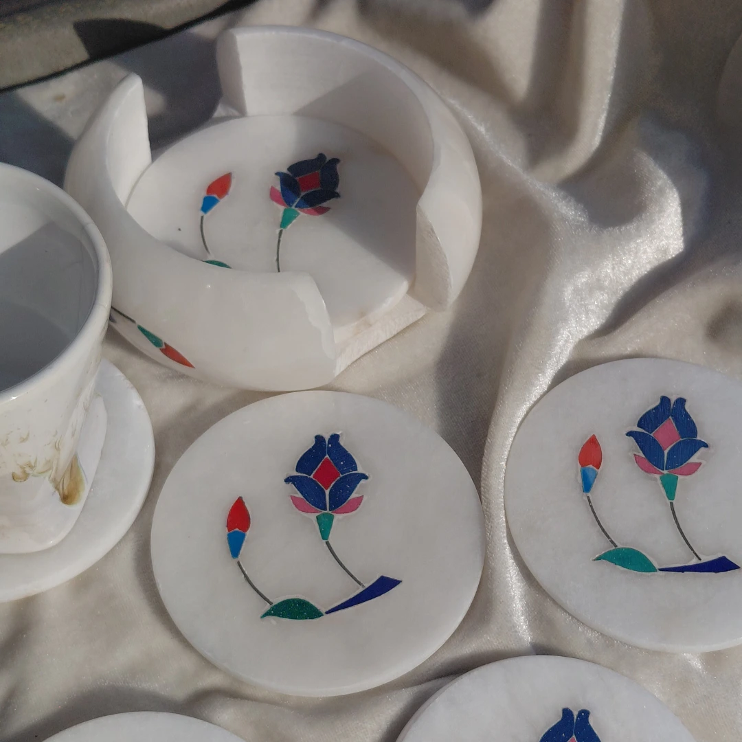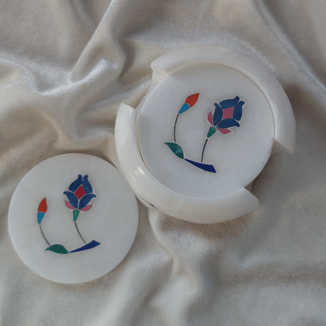 Elevate your home décor with this beautifully handcrafted white marble coaster set, designed to combine timeless elegance with everyday functionality. Each coaster features intricate floral inlay work, created using traditional craftsmanship and carefully set semi-precious stones, making every piece unique.