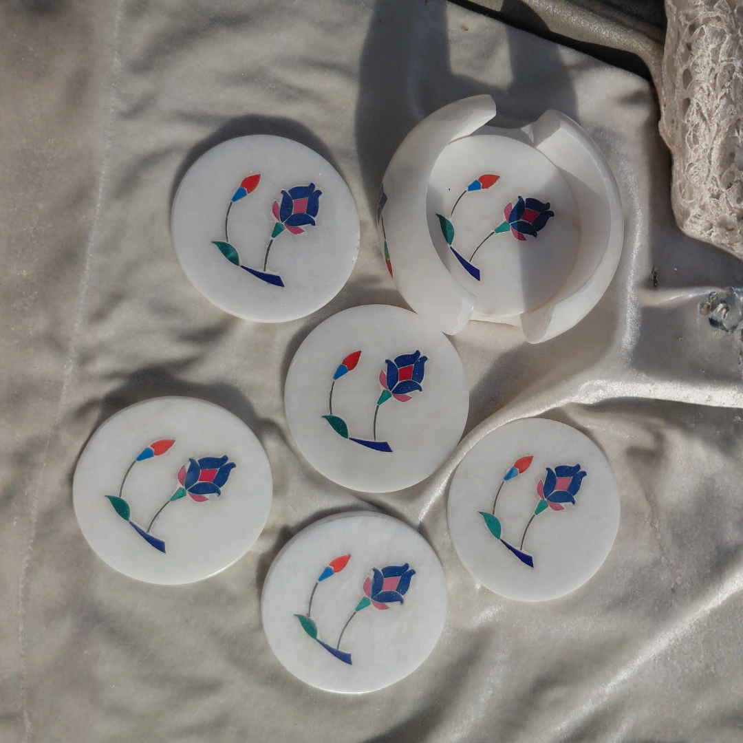 Handcrafted White Marble Floral Inlay Coaster Set with Holder – Luxury Table Décor